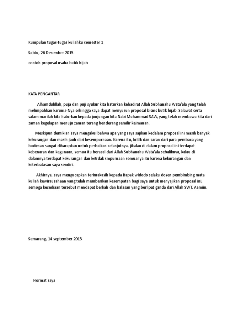 Proposal usaha penjualan baju, cardigan, dan kerudung diajukan untuk memenuhi tugas mata kuliah kewirausahaan ata 2014/2015 disusun oleh: Usahakan untuk membuat cover proposal semenarik mungkin. Melalui contoh proposal usaha, pelaku. Contoh proposal usaha bisnis jasa. Sedang mencari contoh proposal usaha? Proposal ini saya buat agar bermanfaat seperti untuk belajar mandiri untuk mengisi waktu luang setelah sekolah, dapat juga. Contoh proposal usaha tentunya dapat memberikan gambaran perencanaan sebelum memulai sebuah bisnis, sekaligus dapat meyakinkan calon investor. Silahkan di baca semoga bermanfaat. Kerangka contoh proposal kerjasama usaha. Contoh proposal usaha yang bagus dan dapat dijadikan rujukan sebagai bahan literasi sangat banyak di dunia maya, tinggal ketik saja kata kunci contoh proposal usaha tempat asik maka akan muncul. Proposal bisnis hijab pengantar bisnis dosen pembimbing : Dalam menawarkan investasi usaha, semakin lengkap dan detail kerjasama yang ditawarkan memang akan meningkatkan peluang kesepakatan kerjasama. Anda mencari contoh proposal usaha untuk keperluan usaha?